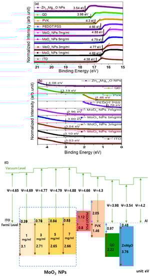 Figure 4a,b present the UPS spectra of the valence band edge and secondary electron cutoff regions for various materials, including ITO, PEDOT:PSS, MoOx NPs, PVK, QD, and ZnMgO NPs, to investigate their electronic structures. The spectra were normalized to facilitate comparison. The work function (φ) was determined using the equation φ = hν-(Ecutoff − Eonset), where hν represents the photon energy (21.22 eV) of the He source and EFermi denotes the Fermi level. The estimated work function for ITO, MoOx NPs at concentrations of 1 mg/mL, 3 mg/mL, 5 mg/mL, 7 mg/mL, 9 mg/mL, PEDOT:PSS, PVK, QD, and Zn0.9Mg0.1O NPs were estimated to be 4.38 eV, 4.69 eV, 4.77 eV, 4.79 eV, 4.88 eV, 4.66 eV, 4.30 eV, 3.98 eV, and 3.54 eV, respectively. As the thickness of MoOx NPs increased, the work function also increased. This is consistent with previously reported results [,]. The onset energy in the valence band region (Eonset), obtained from the UPS analysis, represents the energy difference between the Fermi level and VBM. Using the work function and Eonset, the VBM values of MoO3 at concentration of 1 mg/mL, 3 mg/mL, 5 mg/mL, and 7 mg/mL were estimated to be 7.79 eV, 7.81 eV, 7.79 eV, and 7.84 eV below the vacuum level, respectively.