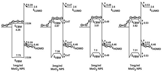 Energy band diagrams of ITO/MoOx NPs (x = 1 mg/mL, 3 mg/mL, 5 mg/mL, 7 mg/mL)/PVK structures.