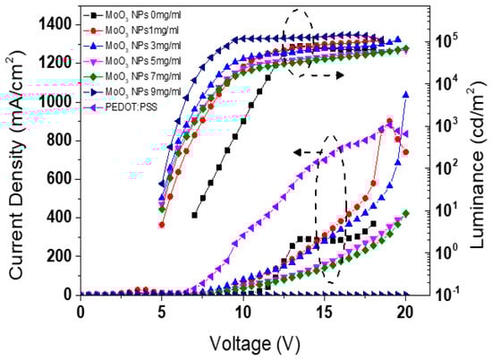 Current density and luminance curves as a function of voltage for the QLEDs with various concentrations of MoO3 NP and PEDOT:PSS HILs.