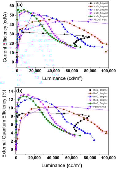 Figure 7 illustrates current efficiency and EQE curves as a function of luminance for the QLEDs with different concentrations of MoOx NP and PEDOT:PSS HILs. The maximum current efficiencies of the QLEDs with 0 mg/mL, 1 mg/mL, 3 mg/mL, 5 mg/mL, and 7 mg/mL concentrations of MoOx NP, and PEDOT:PSS HILs were estimated to be 35.1 cd/A, 45.5 cd/A, 50.4 cd/A, 53.9 cd/A, and 56.0 cd/A, respectively, as shown in Figure 7a. However, the current efficiency of the QLED with a concentration of 9 mg/mL of MoOx NP HIL did not have any current flow, thus preventing the measurement of current efficiency. It was observed that as the concentration of the MoOx NP HILs increased from 0 mg/mL to 7 mg/mL, the current efficiency improved. These results suggest that, despite the increase in current due to the increase in thicknesses of MoOx NP HILs, it is believed that the relative luminance was higher due to the charge balance of electrons and holes in the EML. In contrast, the QLED with PEDOT:PSS HIL exhibited a maximum current efficiency of 44.3 cd/A. This indicates that, while the QLED with PEDOT:PSS HIL achieved higher luminance, it also exhibited higher current density compared to the QLEDs with MoOx NP HILs, resulting in an inferior charge balance.