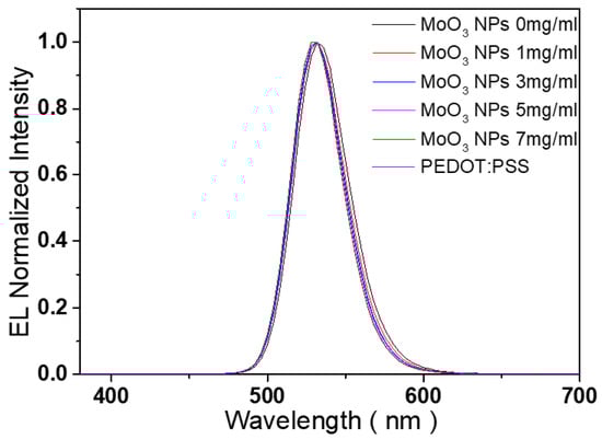 Figure 8 illustrates the normalized photoluminescence (PL) spectrum of the CdSe/ZnS QD, along with EL spectra obtained from the QLEDs with various concentrations of MoO3 NP and PEDOT:PSS. Table 2 summarizes the characteristics parameters of these spectra. It is important to note that the EL peaks of the QLEDs, with both MoOx NP and PEDOT:PSS HILs, are centered at 532 nm, exhibiting a blue-shift of 12 nm compared to the PL peak of CdSe/ZnS QD. The observed blue-shifts can be attributed to factors such as Föster energy transfer, dielectric dispersions, and the Stark effect occurring under high-voltage and -current conditions [,]. The EL spectra of the QLEDs exhibit no undesired parasitic features corresponding to PVK emission, ensuring a high color purity. This observation suggests that charge recombination predominantly occurs within the CdSe/ZnS QD EML. Furthermore, Figure 8 demonstrates that the full width at half maximum (FWHM) of the spectra decreases as the concentration of the MoOx NP HIL increases. Notably, the FWHMs of the spectra for QLEDs with 5 mg/mL and 7 mg/mL MoO3 HILs are narrower compared to the QLED with PEDOT:PSS HIL. The absence of parasitic PVK emissions in the narrow spectra confirms that the device emissions are primarily caused by electron–hole recombination within the CdSe/ZnS QD EML. These findings can be attributed to a favorable charge balance between holes and electrons within the CdSe/ZnS QD EML.