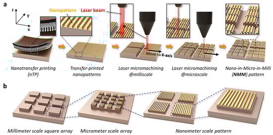 The conceptual strategy used to fabricate NMM pattern structures is schematically depicted in Figure 1. Figure 1a shows the process sequence of NMM pattern formation by the combined patterning method of T-nTP and laser micromachining. Periodic nanoscale patterns are formed on the target substrate by the T-nTP process. Laser micromachining is then implemented on the initial substrates of transfer-printed nanopatterns. During the laser patterning step, the laser beam moves quickly at a speed of 500~10,000 mm/sec and engraves the surface of the target substrate based on pre-designed two-dimensional (2D) images. Figure 1b presents an example of a detailed NMM structure that includes multiscale patterns of nanoscale, microscale, and millimeter-scale pattern structures. Several microscale arrays are located inside the millimeter-scale one-unit cell, and numerous nanoscale patterns are embedded in one microscale pattern unit.