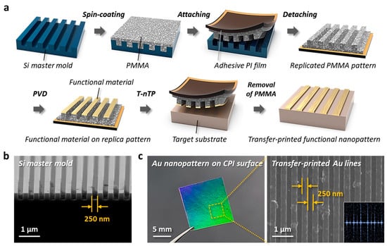 To create nanoscale patterns on an arbitrary substrate, a pattern transfer printing process capable of effectively generating periodic micro-to-nano geometries was used. Figure 2 shows the formation of nanoscale pattern structures on a flexible and transparent CPI film realized by the T-nTP method. The procedure for fabricating nanoscale patterns with functionality is schematically shown in Figure 2a. First, a Si master mold is fabricated by conventional photolithography. A PMMA layer is then coated onto the Si mold and is subsequently peeled off using an adhesive PI tape. PMMA patterns with the reversed shape of the surface of the Si mold are thus successfully replicated. An Au material is then deposited on the protruding parts of the PMMA replica pattern by angle deposition followed by contact on the target substrate. After the transfer printing process, an adhesive PI tape and replica layer are manually removed by hand and solvent flow washing, respectively. Figure 2b shows a cross-section view SEM image of the Si master mold with a width/space of 250 nm. High-quality patterns were precisely engraved on the Si substrate through the photolithography process. Figure 2c presents photographic and top-view SEM images of transfer-printed Au patterns with a width/space of 250 nm, showing precise, well-ordered nanoscale line structures created by the soft printing technique of T-nTP. During the contact-based T-nTP process, regular perfect pressure to avoid air bubble defects and uniform heat injection to effectively move functional nanostructured materials are very important. A heat-rolling-press system can provide uniform pressure and heat on the patterning area for successful pattern transfer printing. PMMA replica material typically undergoes thermal expansion when applying heat above a certain range. However, in the case of a spin-coated porous PMMA layer from the liquid PMMA solution made by dissolving solid PMMA in the liquid solvent, it may shrink, passing the heated rolls depending on the porosity of the polymer layer, as we previously reported []. The interface between the PI tape and the PMMA replica layer can be easily separated due to the weakening of the sticky layer of the PI tape by heat injection. According to this principle of T-nTP, we successfully printed Au line patterns with a width of 250 nm on a flexible CPI substrate over an area of 1.2 cm × 1.2 cm. The inset shows a fast Fourier transform (FFT) pattern obtained from the SEM image, clearly indicating well-ordered high-resolution line structures.