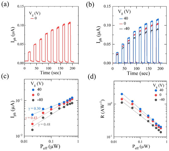 (a) Photocurrent vs. time at room temperature with no back-gate voltage and (b) with different back-gate voltages. (c) Photocurrent vs. effective power illumination in the whole channel region in log–log scale. (d) Responsivity vs. effective power under different back-gate voltages.