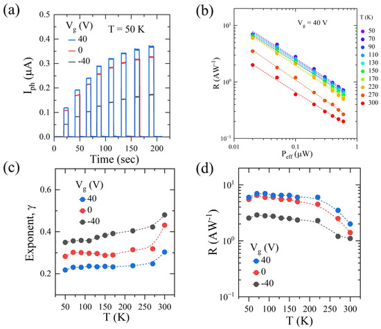 Temperature plays an important role in determining the strength of traps states. Thus, to emphasize the role of traps states on the photogeneration mechanism, we studied the optoelectronic properties at a low temperature (50 K < T < 300 K). Photocurrents at all studied temperatures show similar behaviors as that of those at room temperature. The time-dependent response of the photocurrent (at various Vg’s) measured at the lowest temperature is shown in Figure 4a, and the photocurrent reverts to the drain current under the dark condition as soon as the laser is switched OFF. Responsivity is a function of Peff at constant Vg = 40 V, and all the temperature studies are shown in Figure 4b. Responsivity increased as temperature decreased, indicating strong trapped states.