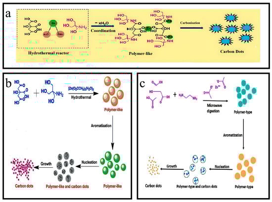 Overview of synthesis of zinc and nitrogen co-doped CQDs. (a) Synthesis of Zn-N-CQDs. Reproduced from [36,37], with permission from Elsevier 2020. (b,c) Synthesis of N,Zn-CDs. Reproduced from [38], with permission from Elsevier 2019.