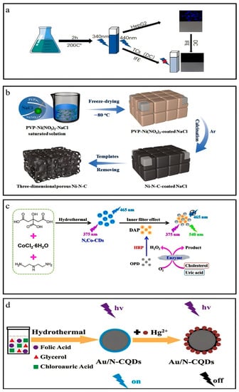 Overview of synthesis. (a) Synthesis of Ce-N-CQDs. Reproduced from [40], with permission from Elsevier 2021. (b) Synthesis of Ni-N-C materials. Reproduced from [42], with permission from Elsevier 2019. (c) Synthesis of N,Co-CDs. Reproduced from [43], with permission from ACS 2019. (d) Synthesis of Au/N-CQDs. Reproduced from [44], with permission from Elsevier 2018.