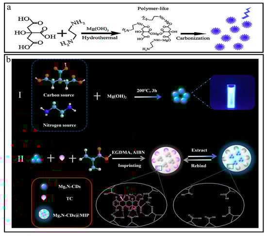 - Hu, X.; Zhao, Y.; Dong, J.; Liu, C.; Qi, Y.; Fang, G.; Wang, S. A strong blue fluorescent nanoprobe based on Mg/N co-doped carbon dots coupled with molecularly imprinted polymer for ultrasensitive and highly selective detection of tetracycline in animal-derived foods. Sens. Actuators B Chem. 2021, 338, 129809. [Google Scholar] [CrossRef]