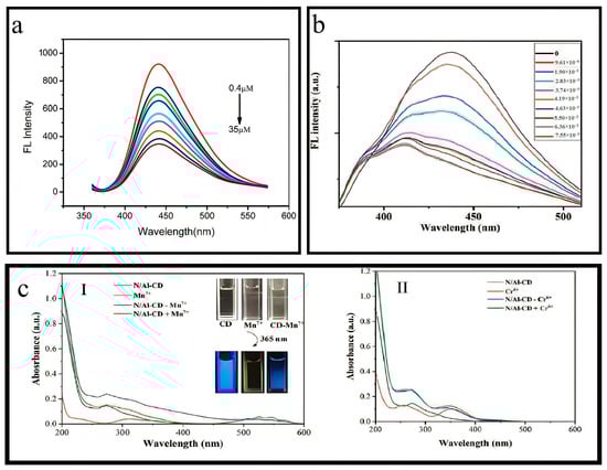 N/Al-CDs’ high-water solubility and optical stability were utilized to create a fluorescent nanoprobe capable of detecting dissolved Mn7+ in water with sensitivity and selectivity. This research explored the selectivity of N/Al-CDs for detecting Mn7+ by analyzing the fluorescence changes in the presence of various metal ions (Figure 7c) [53]. The fluorescence intensity of N/Al-CDs was reduced to 85% upon adding Mn7+. At the same time, the presence of other metals, except Fe3+ and Cr6+, only caused a minor change in intensity of approximately ±5%.