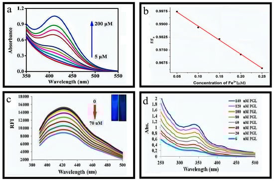 Whereas “Io” is fluorescence intensity in the absence of PGL, “I” is fluorescence intensity in the presence of PGL, and KSV is the static Stern–Volmer constant, which measures the conditional stability constant. The absorption spectra for measuring the PGL solution in the visible region, as depicted in Figure 8c,d exhibit similarities to that of Cu-N@CDs, which was observed at 345 nm. The obtained outcome indicates that the complexation reaction between PGL and Cu in the N@C-dots system yields a product with distinct yellow coloration.