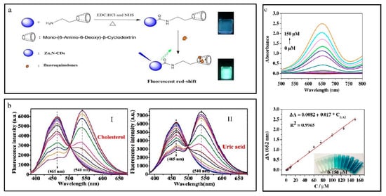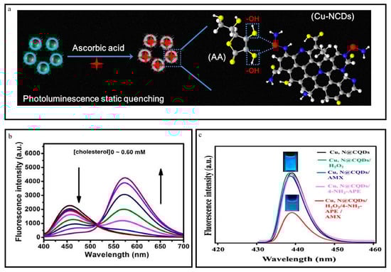The Cu, N@CQDs were synthesized using a one-pot hydrothermal approach. In summary, a solution was prepared by dissolving 0.65 g glucose and 0.45 g CuSO4·5H2O in 50 mL of double-distilled water. A 0.35 mL of ethylenediamine was introduced into the mixture above. Later, the mixture was agitated for 20 min and then followed by the thermal treatment at 200 °C for 10 h. The solution was obtained by adding the sample into centrifugation at 6000 RPM for 15 min. The resulting solution was filtered using a 0.2 μm filter membrane and was subjected to dialysis within a dialysis bag for three days. The dialysis water was replaced every 12 h. The synthesized Cu, N@CQDs were freeze-dried and stored at a temperature of 4 °C (Figure 3c) [35].