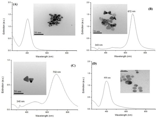 UV-Vis spectra and TEM images of colloidal silver nanoparticles with different shapes. (A) Quasi-spherical silver nanoparticles (QS-AgNPs), (B) silver nanoplates (AgNPts), (C) triangular silver nanoplates (T-AgNPts) and (D) spherical silver nanoparticles (S-AgNPs).