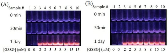 Synthesis of GSSG-Au NCs using 0.4 mM HAuCl4 and different shapes of 4.8 × 10−2 mM AgNPs. Concentrations of GSSG are indicated at the bottom of each figure. The images of the as-prepared GSSG-Au NCs solutions were taken under UV-box detection. Sample # (numbers) are indicated above. (A) Odd numbers (3, 5, 7, and 9) indicate that QS-AgNPs were used as the reductants and even numbers (4, 6, 8, and 10) indicate that T-AgNPts were used as the reductants. (B) Odd numbers indicate that AgNPts were used as the reductants and even numbers indicate that S-AgNPs were used as the reductants.