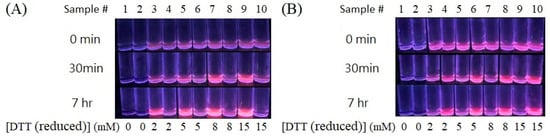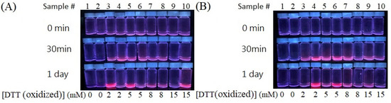 To verify whether all four different shapes of Ag NPs are effective for the synthesis of Au NCs with other capping ligands, DTT was used to replace GSSG. The as-prepared reaction solutions of DTT-Au NCs (labeled temporarily), under the detection of the UV-box, are shown in Figure 3A,B. Interestingly, the results clearly show that DTT-Au NCs can be successfully synthesized when QS-AgNPs (#3, 5, 7, and 9 of Figure 3A) and AgNPts (#4, 6, 8, and 10 of Figure 3B) are used in the reaction. In contrast, much less red fluorescence was observed from the solutions when T-AgNPts (#4, 6, 8, and 10 of Figure 3A) and S-AgNPs (#3, 5, 7, and 9 of Figure 3A,B) were used in the synthesis of DTT-Au NCs, indicating that T-AgNPs and S-AgNPs exhibit less efficiency during the synthesis of DTT-Au NCs. To further understand whether more capping ligands or AgNPs are required to optimize the synthesis of Au NCs, higher concentrations of DTT and AgNPs were used to synthesize DTT-Au NCs. However, fluorescent intensities did not increase significantly, suggesting that higher concentrations of capping ligands or AgNPs are not able to increase the percent yield of Au NCs.