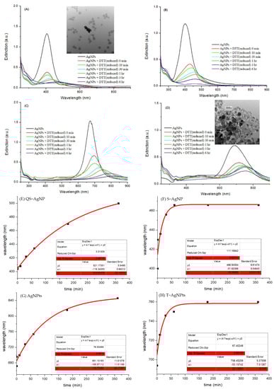 UV-Vis spectra of the association of AgNPs with DTT (A–D) and re-plots of red-shift wavelengths versus interaction times (E–H). (A) QS-AgNP colloids, (B) S-AgNP colloids, (C) AgNPts colloids, and (D) T-AgNPts colloids at various interaction times. Time-dependent AgNP aggregations were shown in (E) QS-AgNP colloids, (F) S-AgNP colloids, (G) AgNPts colloids and (H) T-AgNPts colloids.