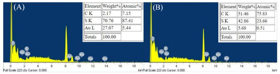 To verify that Au NCs had been successfully synthesized in the presence of AgNPs, the as-prepared Au NCs were observed under TEM. The TEM images showed that synthesized particles were approximately 5–6 nm or smaller (Figure 6A–D). The size of the DTT-Au NCs particles was less than 5 nm when QS-AgNPs or AgNPts were used to mediate the synthesis. However, the average size of the GSSG-Au NC particles was approximately 5–6 nm. These results confirm that the presented method can successfully synthesize Au NCs. To confirm that the images of the particles detected by TEM were not smaller-sized AgNPs, an energy dispersive X-ray spectrometer (EDS) was employed to analyze the compositions of the particles. The EDS results for DTT-Au NCs synthesized by QS-AgNPs and GSSG-Au NCs synthesized by S-AgNPs are shown in Figure 7A,B. The EDS data show that the major components of the synthesized particles were Au, C, and S in both cases. These results suggest that Au is from the core of the cluster, and S is from the capping ligands (DTT and GSSG molecules). No silver elements were detected in these EDS analyses. Therefore, these data confirm that the particles are indeed DTT-Au NCs and GSSG-Au NCs, respectively.