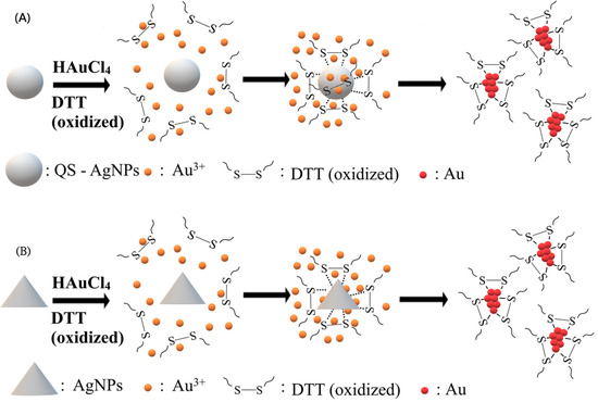 Two differently shaped AgNPs serve as a platform to synthesize Au NCs with small capping ligands. (A) The synthesis of DTTox-Au NCs mediated by QS-AgNPs. The formation of Au NCs was observed on the whole surface of the QS-AgNPs. (B) The synthesis of DTTox-Au NCs mediated by AgNPts. The formation of Au NCs was only observed on the edges and corners of the AgNPts.