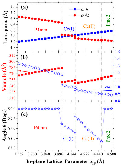 Note that the orientation of ferroelectric polarization tends to tilt away from the out-of-plane in the transition of to and eventually tends to lie along the in-plane direction in the state under epitaxial tensile strain, which is shown in Figure 3a. In the phase, although the out-plane of polarization decreases with the in-plane lattice parameter, the magnitude of polarization is still rather large, at above 160 , up to the boundary of phase transition. For this boundary, the total polarization reduces to 151 in the -I state. While the out-plane of polarization decreases to 45 , the in-plane polarization appears, which is about 102 along y-axis.