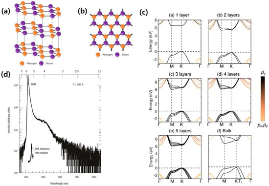 Since the first mechanical exfoliation of monolayer graphene in 2004 [1], atomically thin two-dimensional (2D) materials have shown their exotic physical properties, which are not present in bulk materials. Unlike the gapless semi-metallic properties of graphene, transition-metal dichalcogenides (TMDCs) [2], which are 2D semiconductors, have been found to have a direct bandgap, which corresponds to efficient optical emission from the visible to near-infrared range at the monolayer limit, with possible applications in advanced optoelectronic devices. Furthermore, the atomically thin insulating material hexagonal boron nitride (hBN) is composed of covalently bonded boron and nitride with an sp2 orbital, which is isomorphous with graphene [3]. The single-crystal structure of multilayer hBN is an AA’-type interlayer bonding structure, which appears as a hexagonal structure from the top view, as shown in Figure 1a,b, resulting in a large bandgap opening. Recently, hBN has served as an ideal encapsulation material for graphene in 2D van der Waals heterostructures and 2D semiconductor TMDCs due to its exceptional chemical and thermal stability against harsh environmental conditions, such as high temperatures. Furthermore, due to the absence of dangling bonds and the atomically clean interface, the single-crystal structure of hBN allows for limited intrinsic charge carrier scattering in 2D van der Waals heterostructure devices compared to polycrystal-structured materials, such as silicon dioxide [4,5,6].