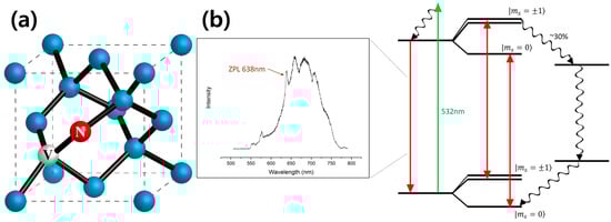 The band structure of diamond (Figure 3b) [18,19] is characterized by a large bandgap between the valence band and the conduction band. The NV center diamond introduces localized energy levels within the bandgap, creating an energy level scheme that involves electronic transitions between these levels. The NV center diamond has a ground state and two low-lying excited states, separated by a zero-phonon line (ZPL). The ZPL wavelength of the NV center in diamond is around 637 nm (nanometers) in the visible region of the electromagnetic spectrum. The ground state corresponds to the electronic configuration of a nitrogen atom in a substitutional site in a diamond lattice with an unpaired electron spin. The two excited states are associated with transitions involving the nitrogen spin and lattice vibrations (phonons).