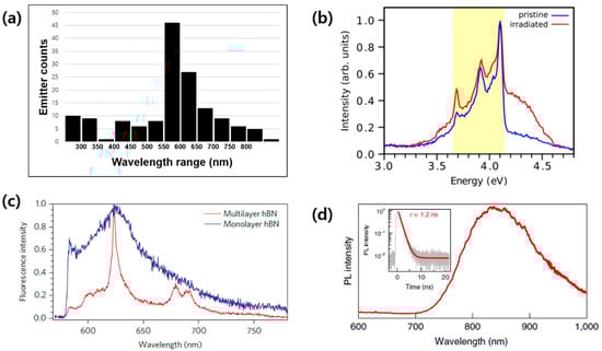 In this paper, we compiled data from recent research papers published between the years 2016 and 2023 ([6,7,8,9,10,11,12,13,14,15,16,17,18,19,20,21,22,23,24,25,26,27,28,29,30,31,32,33,34,35,36,37,38,39,40,41,42,43,44,45,46,47,48,49,50,51,52,53,54,55,56,57,58,59,60,61,62,63,64,65,66,67,68,69,70,71,72,73,74,75,76,77,78,79,80,81,82,83,84,85,86,87,88,89,90,91,92,93,94,95,96,97,98,99]). For further analysis, we present a histogram of the ZPL wavelength of the color centers in hBN, as shown in Figure 5a, which includes 148 data points. The results show that the majority (nearly 50%) of the ZPL is located in the green-to-red visible range (550~650 nm), with some (about 15%) ultraviolet emissions (300~400 nm) and a small number of near-infrared (near-IR) emissions longer than 750 nm. To represent each region of the wavelength, we selected three representative emission spectra, which are shown in Figure 5b–d. Figure 5b from Ref. [39] represents a rare deep ultraviolet emission (~303 nm) from a carbon substitutional color center at a nitrogen site, excited via cathodoluminescence (CL). Figure 5c from Ref. [25] represents the green-to-red visible region (~630 nm), where the majority of hBN color centers are located. Finally, Figure 5d from Ref. [22] represents the near-infrared (near-IR) region (~850 nm) from a boron-vacancy color center. Based on this survey, we can conclude that hBN color center emission covers almost all ranges of visible light, including the deep UV and near-IR regions.