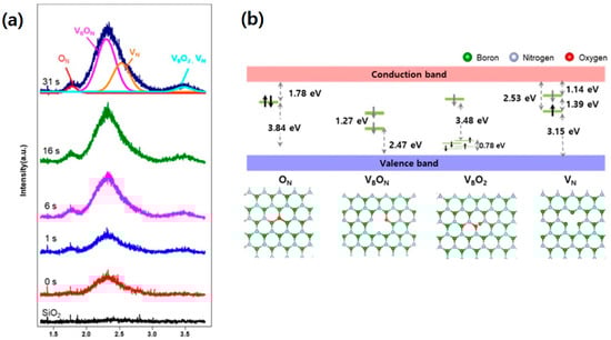Oxygen vacancies in hBN crystals are typically created through thermal annealing or argon plasma etching. In a study by Yang et al. [86], a PL spectrum with an emission peak at 711 nm was observed at room temperature and 11 K after argon plasma etching and annealing of hBN crystals. A PL mapping comparison also showed the effect of oxygen-plasma-induced color center creation. X-ray photoemission spectroscopy (XPS) confirmed the presence of oxygen bonding after plasma etching, indicating the existence of an oxygen-impurity-based hBN color center. Among the theoretically possible oxygen color centers, VBO2, a two-oxygen-atom hBN color center, is proposed as a strong candidate for luminescent oxygen color centers. Another method to create oxygen-related hBN color centers is oxygen plasma etching. In 2021, Na et al. [87] demonstrated how to modulate hBN’s optical and electrical properties by inducing color centers via oxygen plasma treatment. Their study showed prominent PL peaks around 720 nm, and as the time of exposure to the oxygen plasma became longer, the characteristic PL peaks of the oxygen color centers ON, VB, VBON, VBO2, and VN also grew (Figure 9).