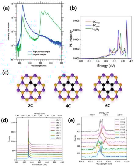 Carbon-impurity-based hBN color center. (a) Cathodoluminescence spectrum of a high-purity hBN sample and an impure sample. As the impurity is added, the 215 nm peak is quenched by an order of magnitude, and other peaks appear around 300 nm~350 nm, showing the deep UV optical gap of the hBN crystal [89]. (b) Simulated PL spectrum of a dimer (CNCB), 4C pair, and 6C ring where the ZPL energies are aligned for the sake of comparison of PSBs [90]. (c) Extended set of hBN carbon color centers with different numbers of substituted carbon atoms: 2, 4, and 6. Orange: nitrogen; purple: boron; black: carbon [91]. (d,e) Low-temperature (5 K) spectra of the eight spots with two different spectral resolutions showing a reproducible ZPL within 0.7 nm [99].