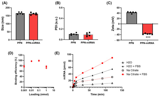 Characterisation of the PPN-miRNA complex. (A) Hydrodynamic size, (B) polydispersity index (PDI) and (C) zeta potential of unfunctionalised and miRNA functionalised PPNs. (D) Binding efficiency of PPNs to miRNA. n = 5. (E) In vitro release profile of miRNA from PPN in nuclease-free water and citrate buffer (pH 7.2) with or without foetal bovine serum FBS. *** p < 0.005 vs. PPN. n = 3.