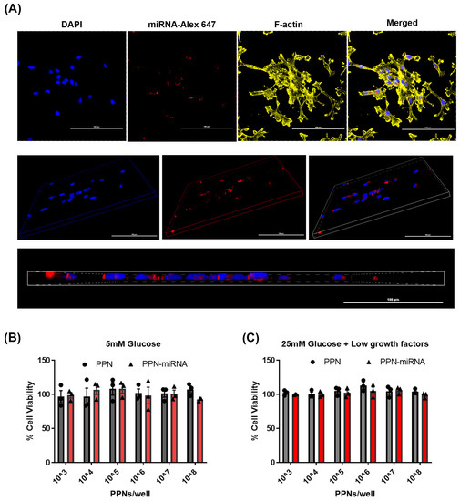Cellular uptake of PPN-miRNA complex. (A) Confocal images of HUVEC uptake of PPN functionalised with Alexa-647-labelled miRNA at 24 h post-exposure. Blue: nucleus staining DAPI; yellow, F-actin; red; PPN-NC5 Alexa647. Scale bar = 100 µm. Fluorescence microscopy images of HUVEC uptake of PPN functionalised with Alex-647-labelled miRNA at 2, 4, and 24 h post-exposure. Cell viability upon delivery of unfunctionalised PPN and functionalised PPN-miRNAs after 3 days treatment. HUVECs were grown in (B) 5 mM glucose with fully supplemented growth factors and (C) 25 mM glucose and low levels of growth factors. Cell viability was normalised to untreated controls. n = 3 independent experiments with technical triplicates.