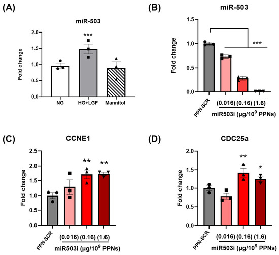 PPN delivery of miR-503 inhibitor modulates miR-503 and its downstream mRNA targets in HG + LGF-grown HUVECs. (A) Relative expression of miR-503 in HUVECs grown in culture medium containing 5 mM glucose (NG), 25 mM glucose with low levels of growth factors (HG + LGF), or mannitol. miR-503 expression was normalised to snRU6 expression. Fold changes are expressed as relative NG controls. *** p < 0.005 vs. NG-grown cells. (B) HUVECs grown in HG + LGF were treated with PPNs complexed with scramble miRNA negative control (SCR) or miRNA inhibitor targeting miR-503 (miR-503i) at concentrations of 0.016 µg miRNA/109 PPNs, 0.16 µg miRNA/109 PPNs, or 1.6 µg miRNA/109 PPNs. Relative mRNA expression of (C) CCNE1 and (D) CDC25a in HUVECs treated with PPN-miR-503i. Fold changes are expressed relative to PPN-SCR. * p < 0.05, ** p < 0.01, *** p < 0.005 vs. PPN-SCR-treated cells cultured in HG + LGF. n = 3 independent experiments with triplicate.