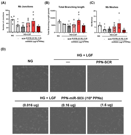 PPN delivery of miR-503 inhibitor enhances endothelial tubulogenesis in HG + LGF. HUVECs were treated with PPN complexed with SCR or miR-503 inhibitor at concentrations of 0.016 µg miRNA/109 PPNs, 0.16 µg miRNA/109 PPNs, or 1.6 µg miRNA/109 PPNs. Tubulogenesis was assessed as tubular network formation in HUVECs cultured on Matrigel and quantified as (A) number of junctions, (B) total branching length, and (C) number of meshes. (D) Representative images of tubular network in HUVECs. * p < 0.05, ** p < 0.01 vs. NG-grown cells; # p < 0.05 vs. PPN-SCR treated cells cultured in HG + LGF. n = 4.