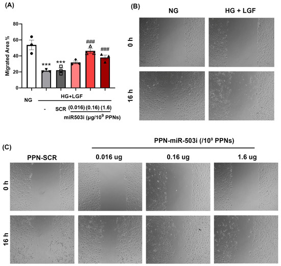 PPN delivery of miR-503 inhibitor promotes endothelial migration in HG + LGF. HUVECs were treated with PPN complexed with SCR or miR-503 inhibitor at concentrations of 0.016 µg miRNA/109 PPNs, 0.16 µg miRNA/109 PPNs, or 1.6 µg miRNA/109 PPNs. Migration was assessed in a scratch-wound assay. (A) Endothelial migration is calculated as the percentage of migrated area. (B) Representative images of HUVEC migration in NG and HG + LGF conditions at 0 and 16 h. (C) Representative images of endothelial migration of HUVECs treated with PPN-scrambled (SCR) or PPN-miR503 inhibitor (miR-503i) in HG + LGF conditions at 0 and 16 h. *** p < 0.005 vs. NG-grown cells; ### p < 0.005 vs. PPN-SCR-treated cells cultured in HG + LGF.