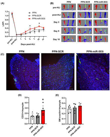 All animal studies were conducted with ethical approval from Garvan Institute/St. Vincent’s Hospital Animal Ethics Committee (Protocol#20/04). Six-week-old male C57Bl/6J mice were purchased from Australian BioResources. Mice were acclimated for a week prior to the start of any experimental procedures. Diabetes was induced in 7-week-old C57Bl/6J mice by bolus intraperitoneal injection of streptozotocin (STZ, 165 mg/kg in citrate buffer, pH 4.5). Blood glucose levels were monitored with an Accu-Chek glucometer. Mice with fasted blood glucose > 15 mmol/L for 3 consecutive days were classified as diabetic. Surgical procedure of unilateral hindlimb ischemia (HLI) was performed in diabetic mice as previously described [26,27]. In brief, the femoral artery was occluded with double knots using 6-0 silk sutures at the proximal location near the groin and the distal location to the knee. Afterward, the vessel was ligated and excised. A sham procedure was performed on the contralateral limb. Immediately after HLI surgery, PPN controls, PPN-scramble miRNA, or PPN-miR-503 inhibitor (1.75 µg miRNAs/µg PPNs/g of mouse) were injected intramuscularly at the adductor muscles. Blood-perfusion recovery was monitored prior to surgery; immediately post-surgery; and day 3, 5, 7, 10, and 14 post-surgery using the laser Doppler Imaging system (moorLDI2-IR, Moor Instruments, Axminster, UK). Blood flow recovery was expressed as laser Doppler perfusion index (LDPI), a ratio between ischemic and non-ischemic limbs of an individual mouse.