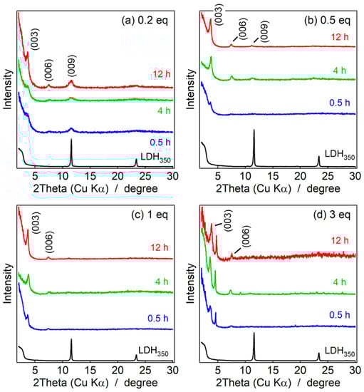 Figure 5 and Figure 6 represent low-angle powder XRD patterns of the LDH2000 and LDH350 before and after reconstruction with MO at various concentrations and reaction times. As can be seen, the (003) peaks of the pristine LDHs shifted from 2θ = 11.7° to 3.5°, indicating the intercalation of the MO between the LDH layers. The (003) peak intensity of 0.5–3 eq was higher than that of 0.2 eq as the higher MO concentration, leading to effective intercalation and interlayer molecular arrangement of the MO [49]. We could also find that the crystallinity along the (003) plane generally became better upon the reaction time. These results suggest that the interlayer molecular arrangement of MO became ordered upon the reaction time. The peak around 2θ = 5°, which is only seen with 3 eq, might be attributed to the inter-molecular packing among the MO moieties.