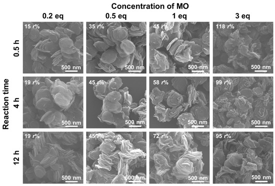 SEM images of LDH350 reconstructed with MO at the concentration of 0.2 eq, 0.5 eq, 1 eq, and 3 eq and the reaction time at 0.5 h, 4 h, and 12 h with the inset value of the loading ratio, r%.