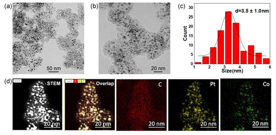 Lower (a) and higher (b) magnification TEM images, size distributions of supported nanoparticles (c), and HAADF-STEM-EDS-mappings (d) of Pt3Co2/C-8h catalysts with a Pt loading of 40%. The subfigures from left to right in (d) mean HAADF-STEM image, overlapped image C, Co and Pt images.
