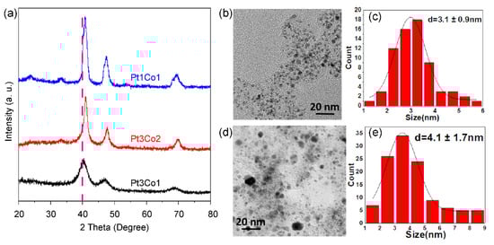XRD patterns of (a) Pt3Co1/C-8h (black curve), Pt3Co2/C-8h (red curve), and Pt1Co1/C-8h (blue curve) catalysts. TEM images (b,d) and size distributions (c,e) of supported nanoparticles of Pt3Co1/C-8h (b,c) and Pt1Co1/C-8h (d,e) catalysts.
