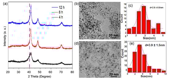 XRD patterns (a) of Pt3Co2/C-4h (black curve), Pt3Co2/C-8h (red curve), and Pt3Co2/C-12h (blue curve) catalysts. TEM images (b,d) and size distributions (c,e) of supported nanoparticles of Pt3Co2/C-4h (b,c) and Pt3Co2/C-12h (d,e) catalysts.