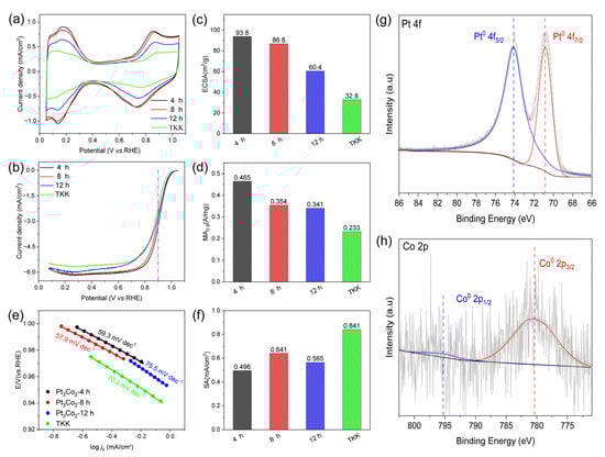 Electrocatalytic performance. (a) CV curves in N2-saturated 0.1 M HClO4, (b) LSV curves of the Pt3Co2/C-4h, Pt3Co2/C-8h, Pt3Co2/C-12h, and TKK catalysts (with internal resistance corrected) in O2-saturated 0.1 M HClO4. Comparison of (c) ECSAs and (d) MAs of the catalysts at 0.9 V (vs. RHE). (e) Tafel curves. (f) Specific activities (SAs). (g,h) High-resolution XPS results of Pt 4f and Co 2p for Pt3Co2/C-4h particles. The measurements were performed on an RDE with a rotating speed of 1600 rpm at 25 °C.