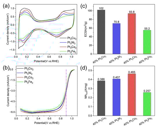 As a meaningful addition, we also studied the electrochemical performance of the obtained catalysts, as shown in Figure 4. The CV curves (Figure 7a) show that the hydrogen adsorption/desorption current density of Pt3Cu2/C (black curve) is higher than that of Pt3Co2/C, Pt3Fe2/C, and Pt3Ni2/C catalysts. The LSV curve of the Pt3Co2/C catalyst shows the largest polarization current at 0.9 V. The ECSA values (Figure 7c) for Pt3Cu2/C, Pt3Co2/C, Pt3Ni2/C, and Pt3Fe2/C catalysts are 102, 93.8, 70.8, and 55.2 m2/g, respectively. The MA0.9 values (Figure 7d) for Pt3Cu2/C, Pt3Co2/C, Pt3Ni2/C, and Pt3Fe2/C are 0.386, 0.465, 0.407, and 0.257 A/mg, respectively. It can be found that the size distribution and activity can be further adjusted by changing the doping metals.