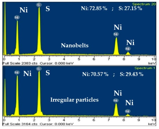 The β-NiS irregular particles with weight percentages of 70.57 wt.% and 29.43 wt.% are presented in the image of the bottom pattern in Figure 7. The calculation result of a molar ratio is approximately the value of 0.8 (S/Ni). With respect to the results of EDS analysis patterns for the β-NiS films, these were like the other EDS analysis patterns [34]. The final products of the β-NiS films presented an important result. The adjustment of the weights for the sulfur sheet is an intriguing method. It was shown that a lighter sulfide sheet combined with the nickel film could present a chance to create the β-NiS nanobelts.