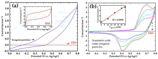 (a) The measurement of cyclic voltammogram shows the result of β-NiS irregular particle film in a NaOH solution. Inset image: the cyclic voltammogram shows the value of the bare ITO glass substrate. (b) The cyclic voltammograms (CVs) of NiS nanobelt film show the results by applying CV in a NaOH solution at variable glucose concentrations: 0 µM, 10 µM, 20 µM, 30 µM, and 35 µM. Inset: drawing of oxidation peak current against variable glucose concentrations.