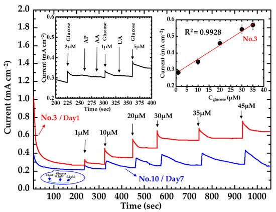 Figure 11 shows that the values of the current response to the varying glucose concentrations were observed from 1 µM to 45 µM. In the inset (top right) of Figure 11, the average values of current response were also recorded from testing the specimen (No. 3). The results of measurement could be drawn as a red trendline with a linear relationship. The red trendline was shown with a correlation coefficient of 0.9928 in the inset (top right) of Figure 11 for the specimen No. 3.