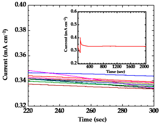 where the ζslop is the value of sensitivity for the equation. The ζslop is the value of 8.67 ± 0.76 µA cm−2 µM−1. The intercept in Equation (4) has been estimated around 0.28 ± 0.03. The β-NiS nanobelt film was also ready for selectivity measurement. The result for the selectivity of the β-NiS nanobelt electrode is shown in the inset (top left) of Figure 11. The relative response from the various interferences has been recorded with the different addition. The interference effects were minimal with 2 µM uric acid (UA), ascorbic acid (AA), and 4-acetamidophenol (AP) during the detection of the glucose. The measurements for a duration of 7 days were carried out by using the two specimens (No. 3 and No. 10). The values of the measurement for a period of 7 days were also recorded in Figure 11 and Table 2. The values of the current response using the specimen (No. 10) decreased by 76% compared to the initial value on the seventh day. However, the values of the current response using the specimen (No. 3) only decreased by 10% from the initial value on the seventh day. The current response of the β-NiS nanobelt film was measured by using the fixed glucose concertation. Ten successive amperometric curves of 10 μM glucose using the β-NiS nanobelt film were recorded by amperometry, as shown in Figure 12.