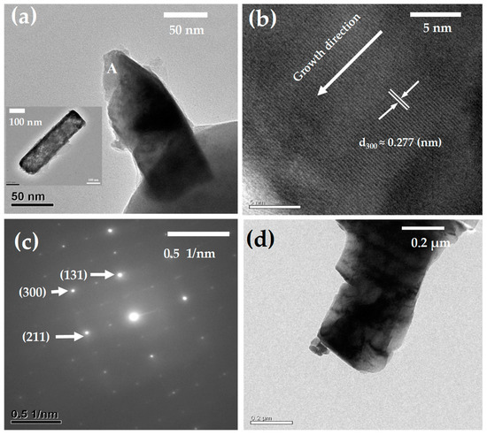 After they were synthesized, the β-NiS nanobelts were analyzed by using an HR-TEM analysis. The image of a broken nanobelt used in the analysis of the lattice fringes with A and an individual nanobelt can be seen in the inset of Figure 13a. The lattice fringes in Figure 13b are visible on the HR-TEM image with an interspace of 0.2772 nm. The distance between two adjoining planes (300) of the β-NiS nanobelt was about 0.277 nm. The SAED configuration of the β-NiS nanobelt for the diffraction spots has been indexed to the planes (131), (300), and (211), as illustrated in Figure 13c. Upon the HR-TEM analysis, the β-NiS nanobelts were observed that were confirmed by the JCPDS card (120041) again. After completing the electrochemical analysis for the β-NiS nanobelt film, this specimen was analyzed by using HR-TEM analysis again. Figure 13d reveals the HR-TEM image about a nanobelt when it can be completed a long-term storage test and the electrochemical analysis from the β-NiS nanobelt film. The image also provided the certification for the β-NiS nanobelt that underwent a long-term storage test after finishing an electrochemical analysis.