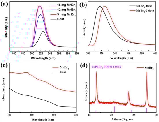 (a) CsPbBr3 PQDs PL spectra of Mn2+ doping with different contents, (b) PL spectra of Mn2+ doping CsPbBr3 PQDs at initial and after 3 days, (c) absorption spectra, (d) XRD spectra.