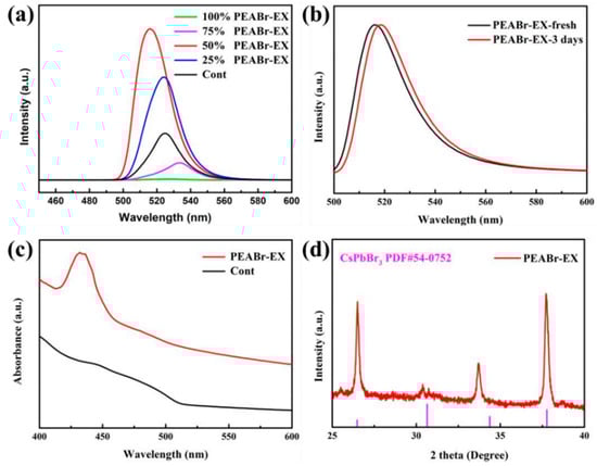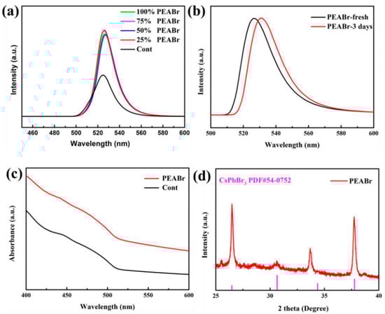(a) CsPbBr3 PQDs PL spectra of the PEABr partial exchange ligand OAm in different proportions, (b) PL spectra at initial and after 3 days, (c) absorption spectra, and (d) XRD spectra.