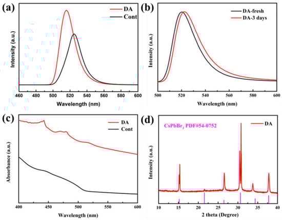 To explore the effect of DA on the optical properties of QDs after and before the replacement of ligand OA by DA, we test the comparison between the ligand OA after and before the replacement by DA. As shown in Figure 11a, after the ligand OA is replaced by DA, the PL emission intensity increases to a certain extent and the emission wavelength is blue-shifted. As shown in Table 2, PLQY increased from 60.2% to 83.5% before substitution. The compelling reason for this lies in the potent attachment between the short-chain ligand DA and the surface of the quantum dot. This attachment significantly diminishes the loss of surface ligands, ultimately resulting in superior surface passivation, minimal surface defects, and reduced non-radiative recombination [30]. At the same time, the conductivity of the short-chain ligand, which replaces the original long-range insulating ligand, is significantly improved and the carrier transport rate is accelerated, which is favorable for luminescence. As shown in Figure 11b, the intensity of the luminescence does not decrease after 3 days, the wavelength of the luminescence is only redshifted from 516 nm to 519 nm, and the stability is slightly improved compared to the control. It can also be seen from the absorption map in Figure 11c that the QD absorption after ligand substitution is significantly higher than that of the control group, indicating an improvement in its optical performance, in agreement with previous results. From the XRD pattern of Figure 11d, it can be seen that the diffraction peaks at 15.2°, 26.5°, 30.6°, and 37.8° correspond to (100), (111), (200), and (211) crystal planes of perovskite, and there are two additional CsPbBr3 characteristic peaks than before ligand substitution, but it is still the CsPbBr3 PQD structure.