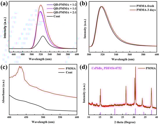 To explore the impact of different ratios of PMMA encapsulation on the stability and optical properties of QDs, we tested QDs with PMMA encapsulation QD: PMMA = 1:2, QD: PMMA = 1:1, QD: PMMA = 2:1, and compared them to those without PMMA, as shown in Figure 13a. After packing with different ratios of PMMA, the PL emission intensity increases significantly and the emission wavelength is blue-shifted. The intensity of PL emission is at its highest when the QD: PMMA packing ratio is 2:1, as shown in Table 2. This indicates that the size of QDs is reduced and the luminosity performance is improved. PLQY increases from 60.2% to 90.1%, which is the highest improvement among the optimization methods. PMMA acts as an ideal protective layer and isolates external factors like water and oxygen that can affect the stability of QDs. Based on the data presented in Figure 13b, it can be observed that the luminosity remains constant even after 3 days. Additionally, there is only a slight shift in the luminosity wavelength from 520 nm to 521 nm, indicating an impressive level of stability when compared to the control group. It can also be seen from the absorption diagram in Figure 13c that the absorption of packaged quantum dots is significantly higher than that of the control group, indicating that the improvement of its stability is also conducive to the improvement of optical performance, which is consistent with the previous results. Upon analysis of the XRD pattern for Figure 13d, it is evident that the peaks detected at 15.2°, 26.5°, 30.6°, and 37.8° correspond to the (100), (111), (200), and (211) crystal planes of perovskite, respectively. Additionally, there are two distinct peaks characteristic of CsPbBr3 when compared to the previous packaging, yet it remains consistent with the CsPbBr3 PQD structure.