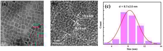To measure the size of the CsPbBr3 PQDs, the QDs packed with the relatively stable PMMA were chosen for the TEM and HRTEM tests in this paper to minimize the effect of the clustering and size increase due to instabilities in the measurement process. As shown in Figure 14a,b, we can see that the size of the QD is between 10 nm and 15 nm, and the lattice spacing is 0.34 nm. As shown in Figure 14c, the average size of the QD is about 8.7 nm.